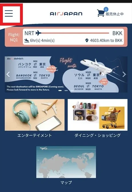実際には、当日はオンライン注文はしていず、CAさんを呼んで注文するスタイルでした。